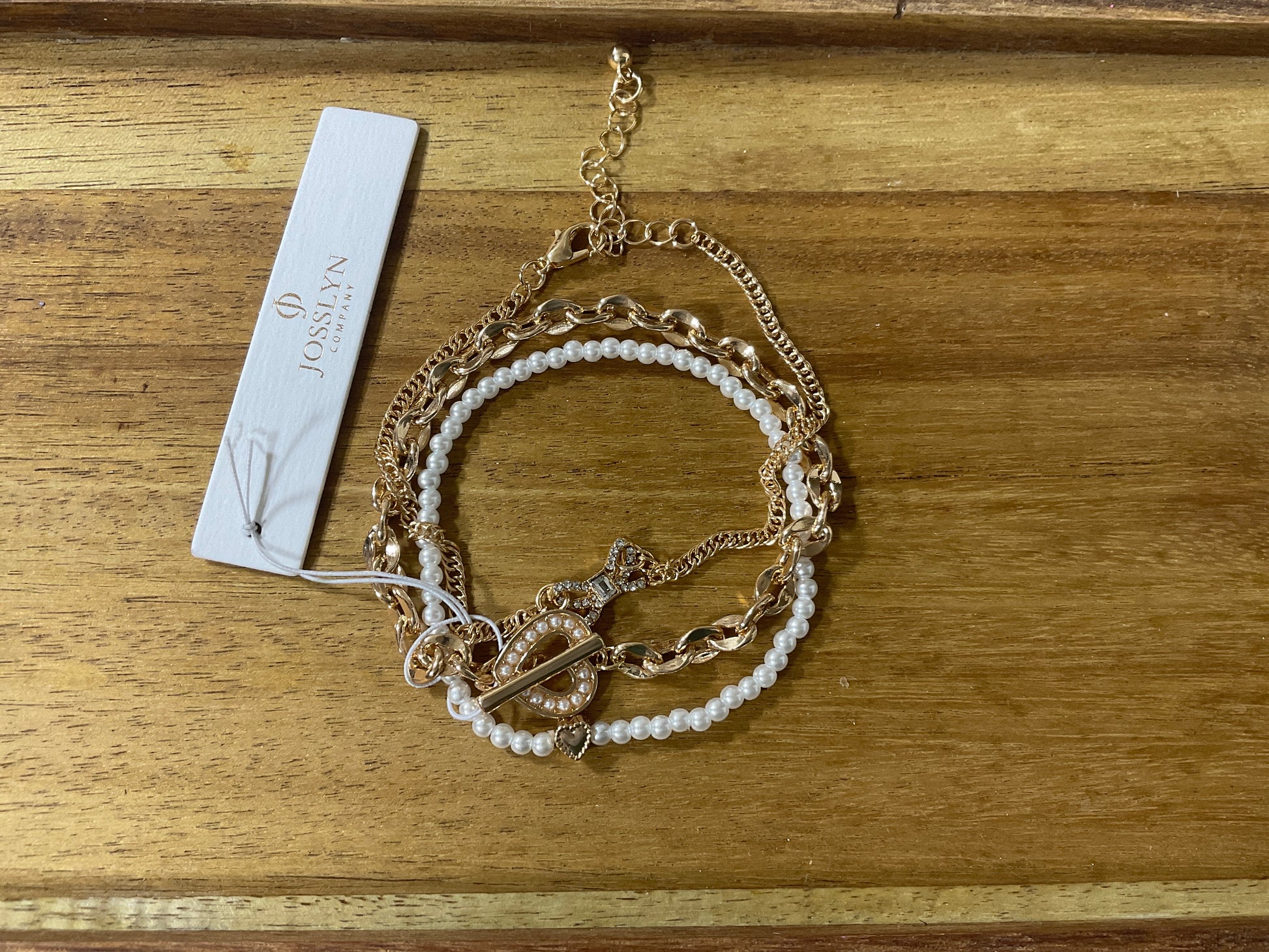 Enhance your outfit with this elegant 3 row bracelet set featuring delicate bow and heart designs and lustrous pearls. Made with high-quality materials, this bracelet set is a must-have accessory that effortlessly adds a touch of sophistication to any look. Perfect for any occasion, this set makes a thoughtful and timeless gift for yourself or a loved one.