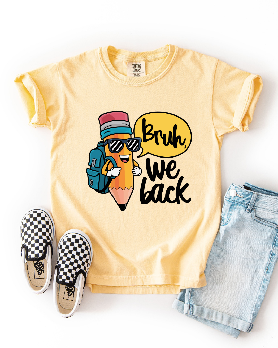 Get your kids' back to school wardrobe ready with our Bruh We Back Graphic Tee! Made with comfortable crunchberry comfort color branded fabric, this tee features a playful design that will have everyone saying "bruh" all day long. Perfect for those who don't take themselves too seriously.