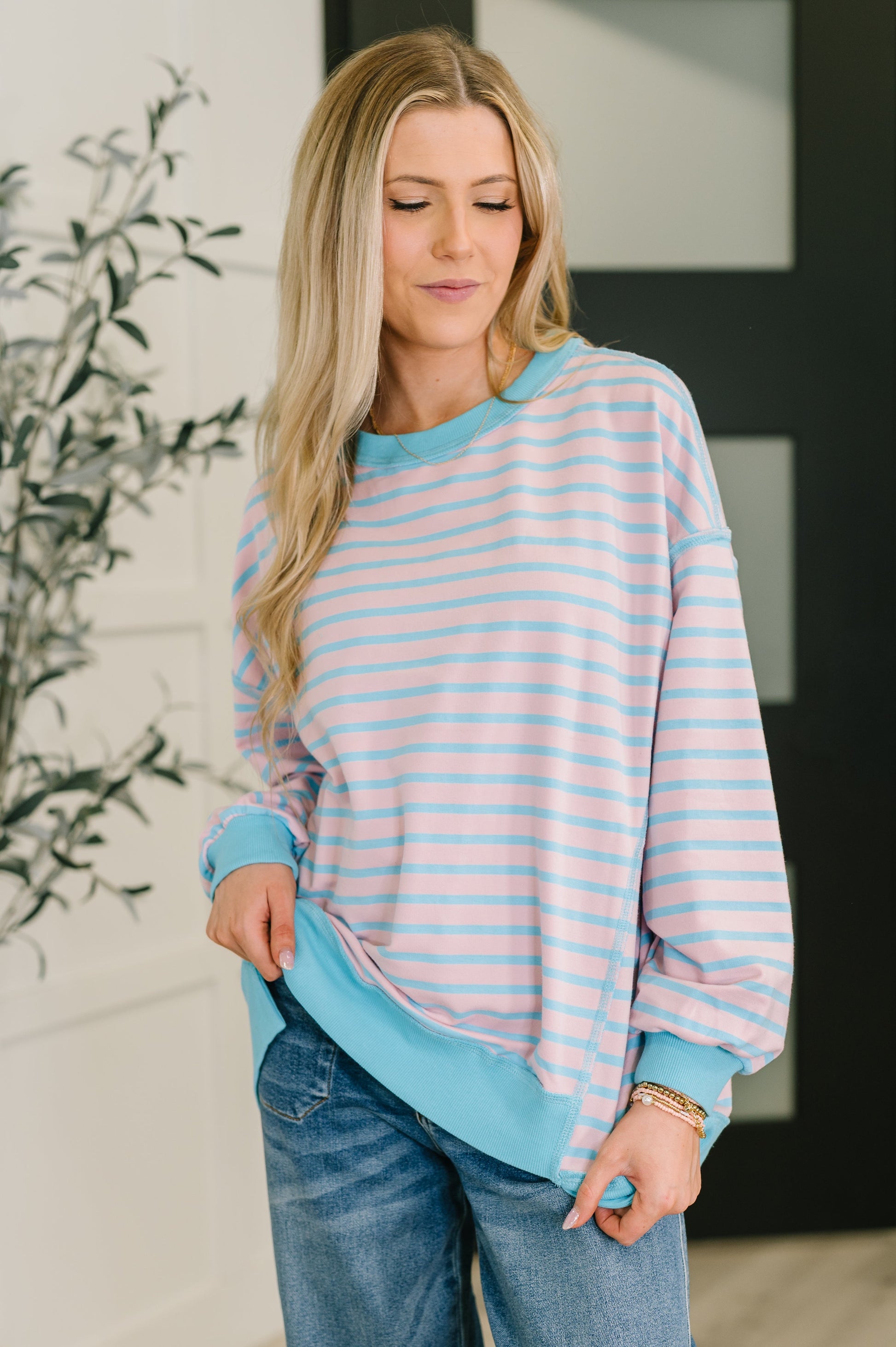 This Color Clash Drop Shoulder Long Sleeve combines playful style with comfy details. Made from high-stretch French Terry, it features a banded ribbed round neckline, cuffs, and stepped hem for a snug yet flexible fit. The drop shoulder design and exposed seam details add a fun, laid-back vibe perfect for everyday wear.