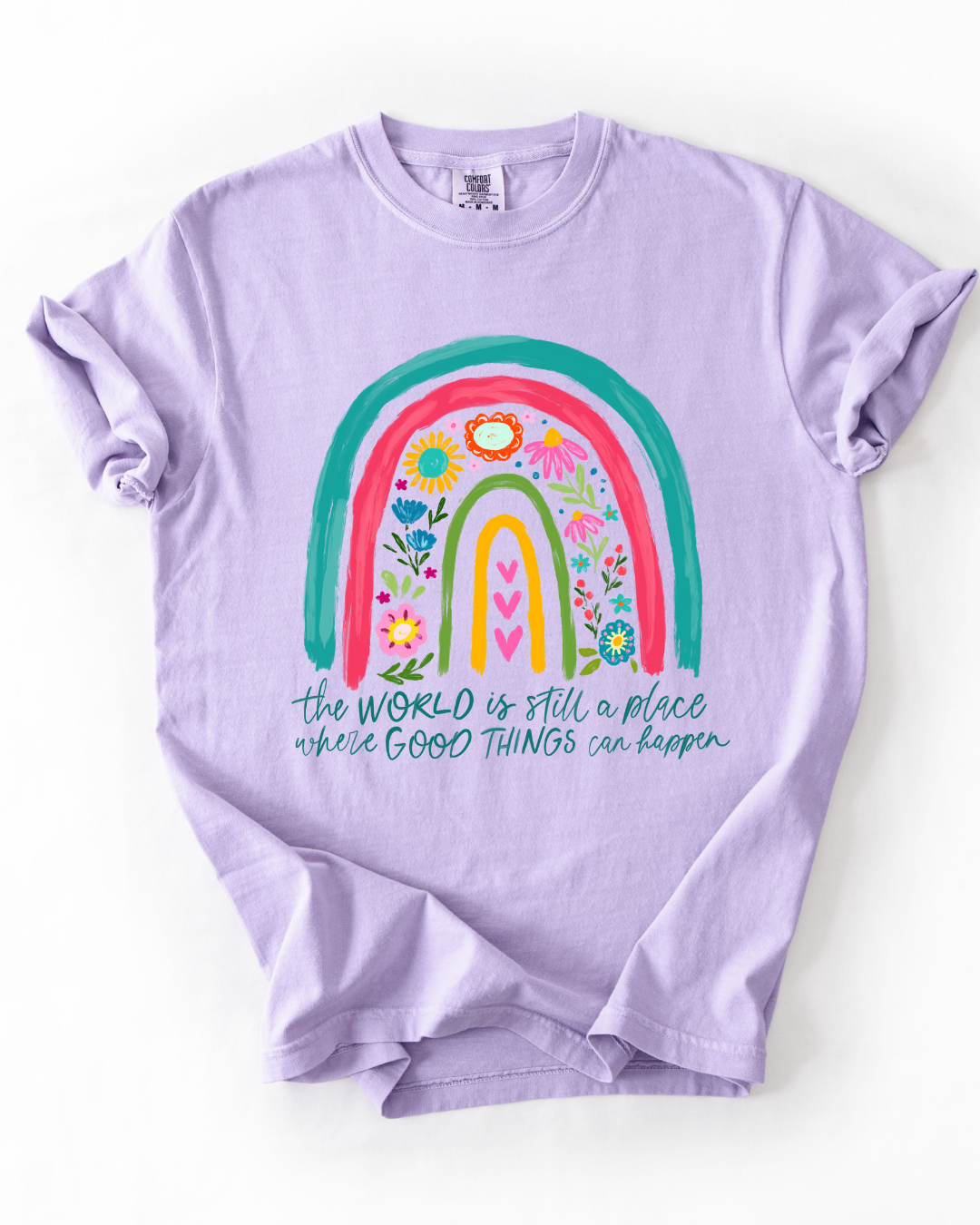 Add a pop of color and positivity to your wardrobe with our "Good Things Can Happen" graphic tee! This soft lilac shirt features a hand-painted style rainbow adorned with whimsical floral details and a heartfelt message: "The world is still a place where good things can happen." Made from breathable cotton for all-day comfort, this tee is perfect for casual days, layering, or spreading a little extra joy wherever you go. Pair it with your favorite jeans or lounge pants for an effortlessly cheerful look!