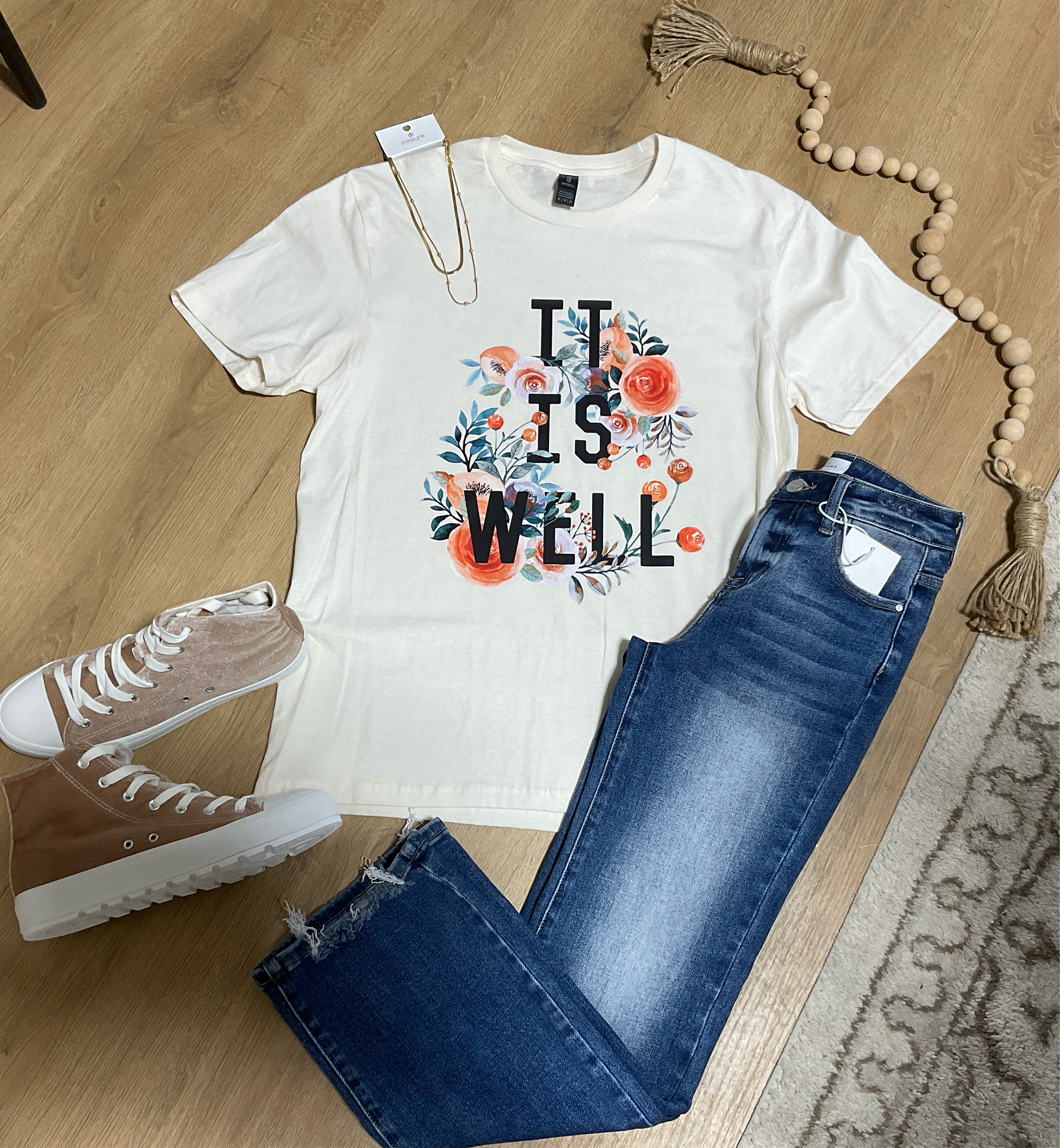 The It Is Well Graphic Tee is a must-have for any wardrobe. With a beautiful floral graphic, this tee not only adds a pop of color to your outfit, but it also serves as a daily reminder to embrace positivity and wellness. Made from high-quality materials, this tee ensures comfort and durability.