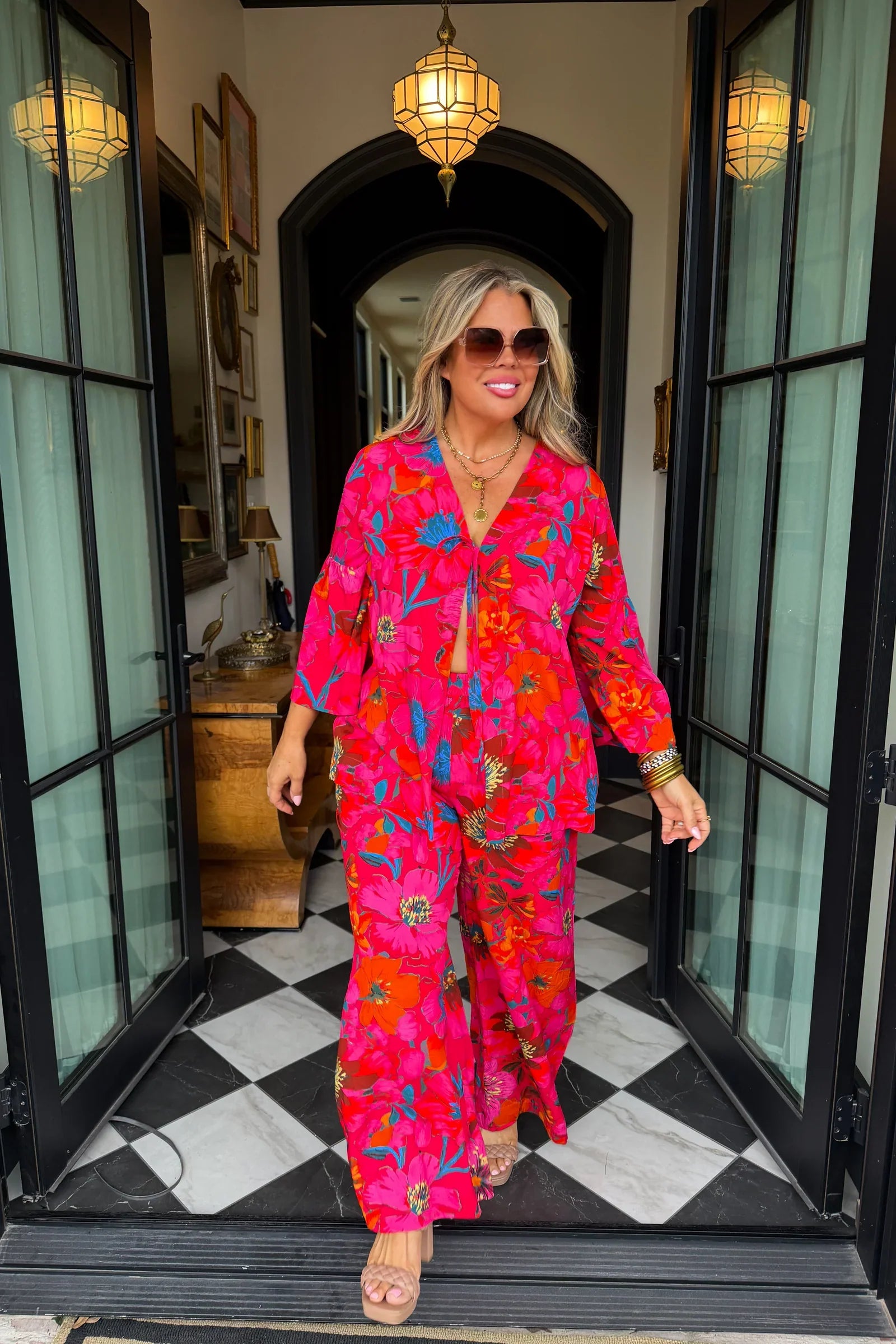 Featuring a flowy button-down top with a playful tie detail and matching wide-leg pants, this outfit is designed for comfort and standout style. The vibrant mix of pink, red, orange, and teal florals gives it a tropical, resort-ready vibe that’s perfect for vacations, brunch, or a day out.